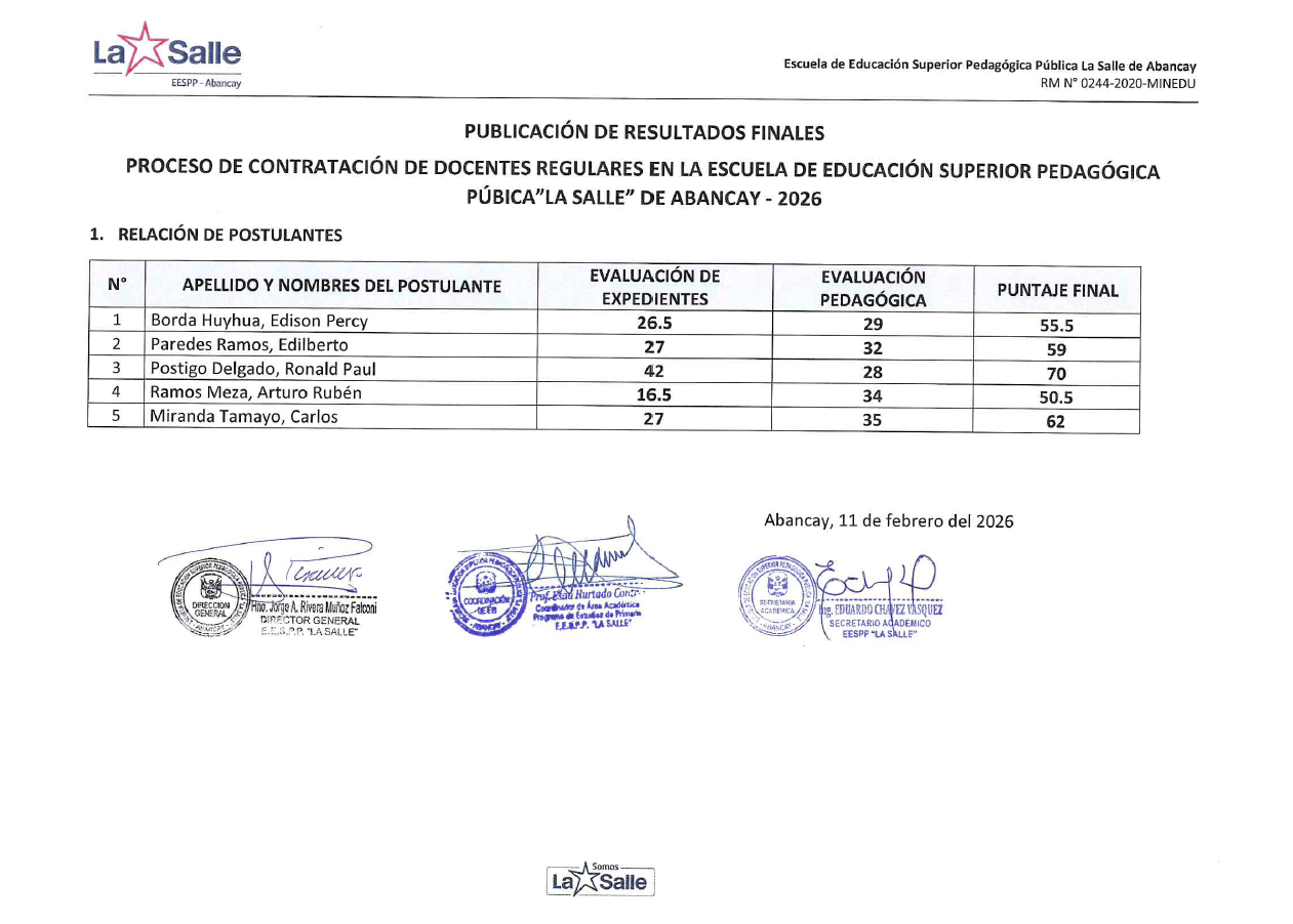 Resultados finales de postulantes en el proceso de contratación docentes regulares – 2026
