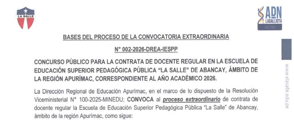 La Dirección Regional de Educación Apurímac, en el marco de lo dispuesto de la Resolución Viceministerial N°100-2025-MINEDU; CONVOCA al proceso extraordinario de contrata de docente regular en la Escuela de Educación Superior Pedagógica Pública «La Salle» de Abancay ámbito de la región Apurímac.